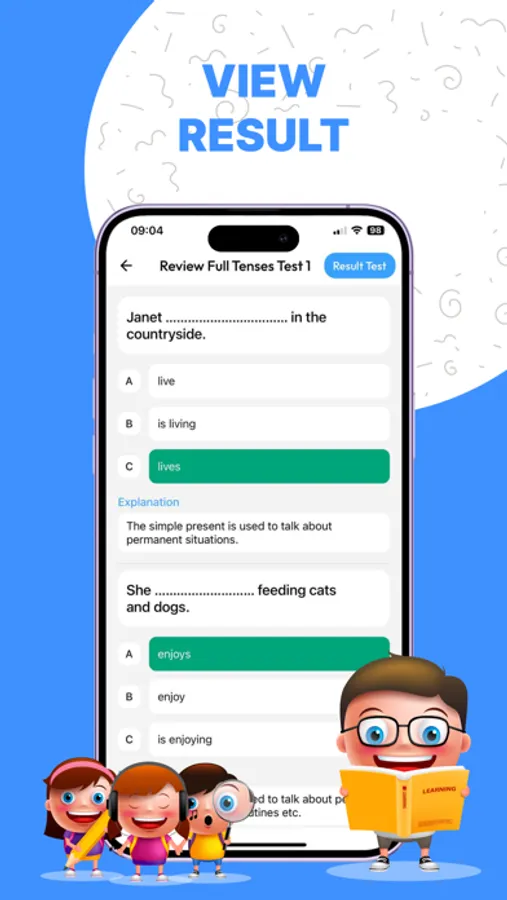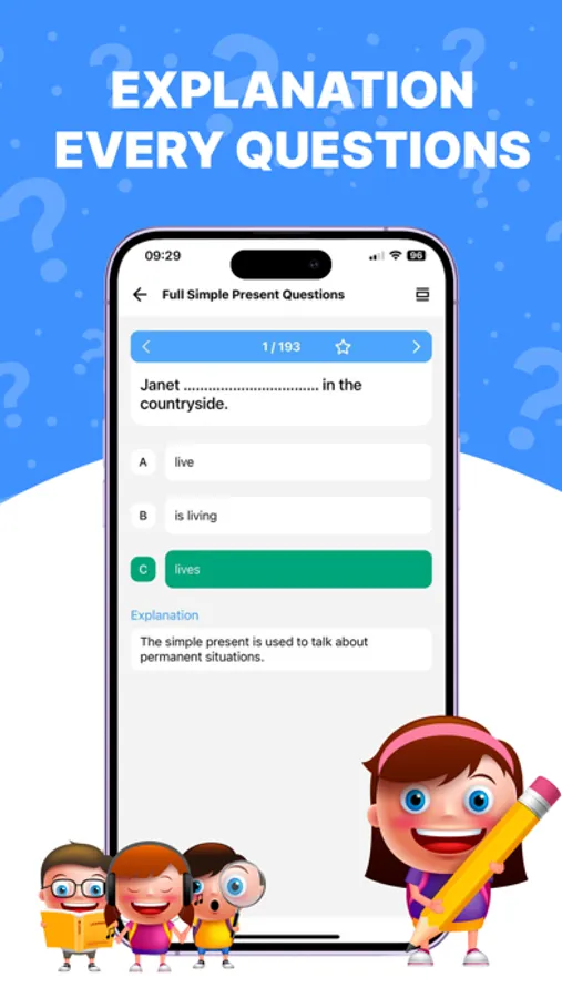 • Test mode with a time limit help you improve grammar skills and memorize questions in the easiest way