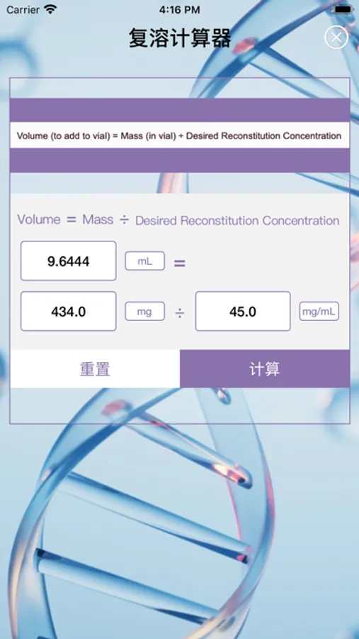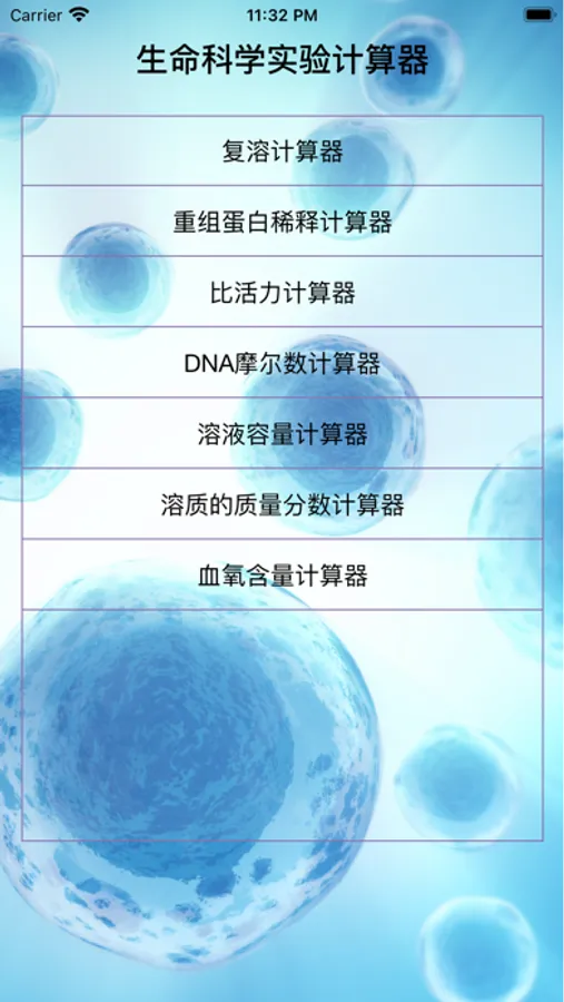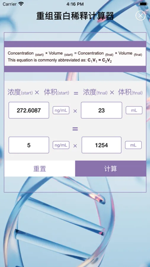 生命科学实验是人类进步的重要阶梯。在这里我们为做生物实验的朋友们提供一款简单实用的计算器,包含有复溶液浓度的计算、重组蛋白稀释的计算、比活力的计算,记忆实验过程中能用到的其他药物、容量等计算器。
