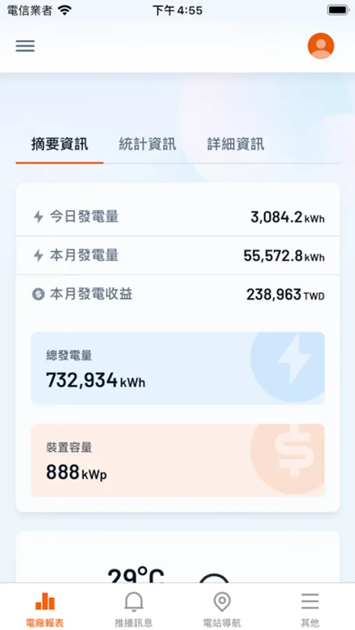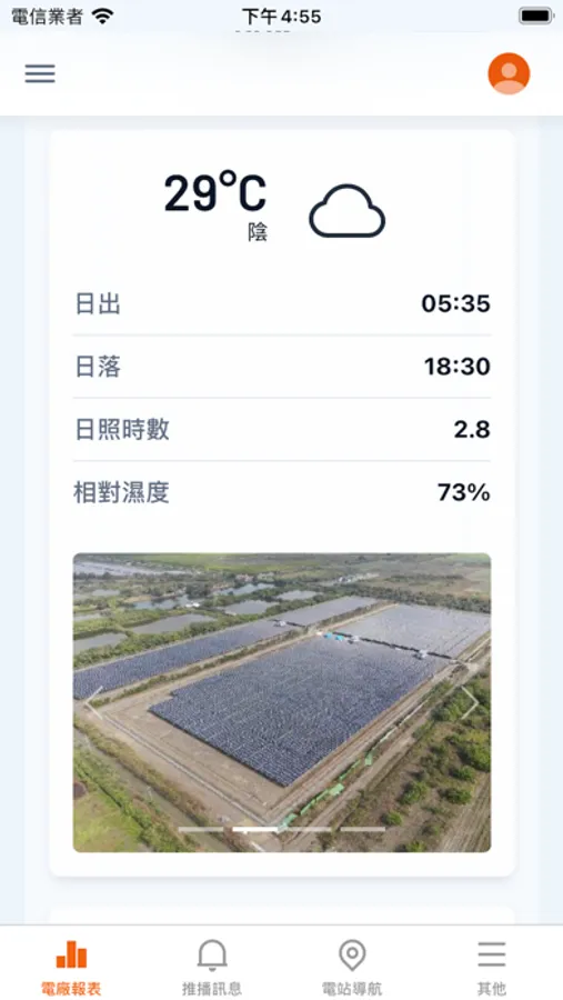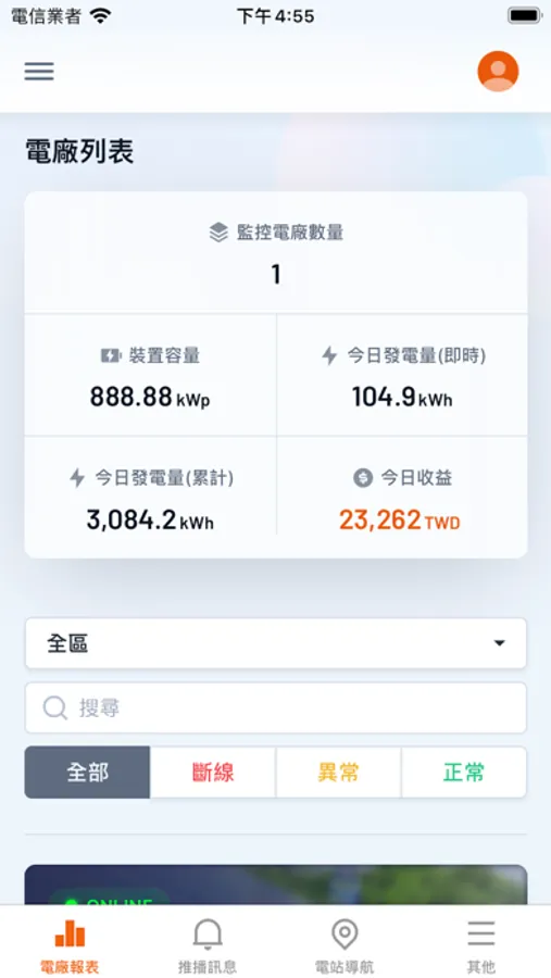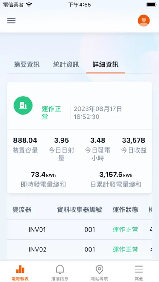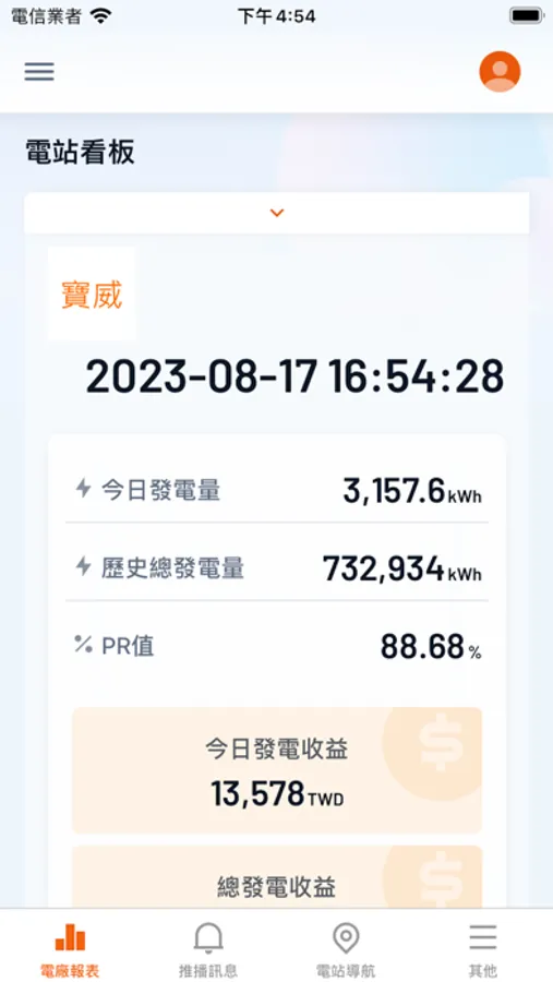 寶威太陽能監控系統透過APP及Web的結合,提供完整太陽能發電各項數據,查詢即時且正確的數值。 經由 APP 推播,系統主動發送訊息,達到即時預警,進而可以提前處理,增加發電收益,降低事故風險。 對於電廠業主、維運人員、 系統人員均是方便可靠的管理工具,利用導航及站點狀態功能,可以協助維護人員到達指定站點進行維修作業,大大提升模組維運效率。