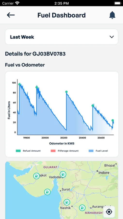 Fuel Level Monitoring:  Get to know exact refuel and pilferages in your fleet with time and accurate location of the fueling events. Get live alerts for your vehicles with low fuel.