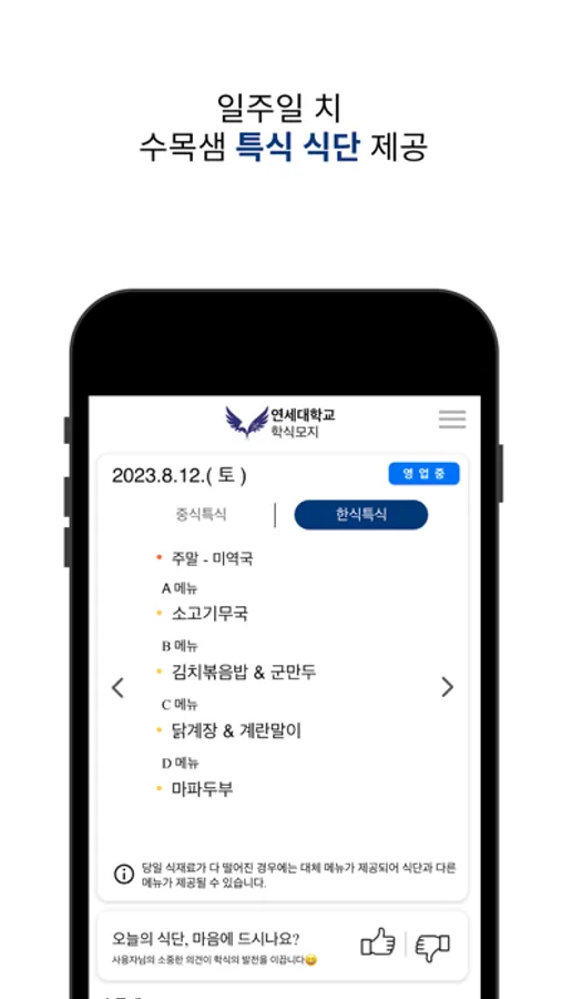 - 일주일 간의 수목샘 중식, 한식 특식 식단 제공