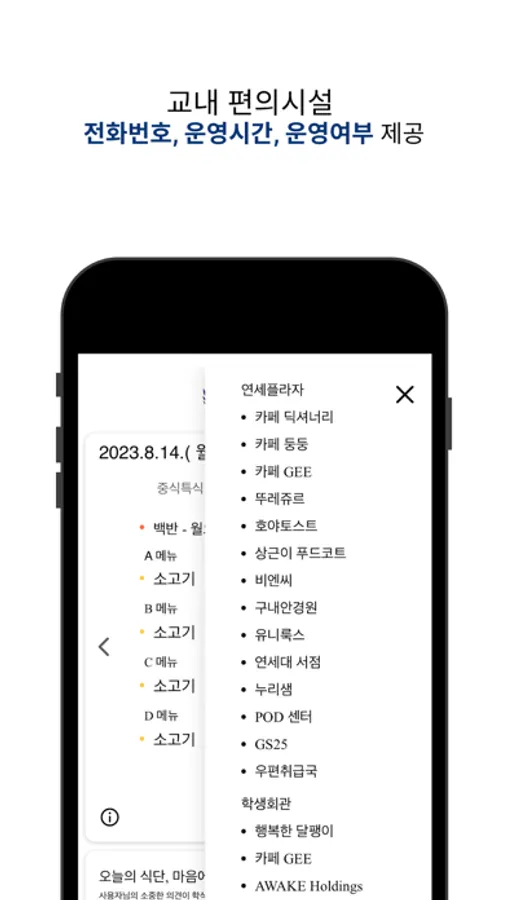 학식 메뉴를 몰라 직접 가서 확인해야했던 연세대학교 미래캠퍼스 학우분들을 위한 학식 메뉴 및 편의시설 운영시간 정보 제공 앱입니다!