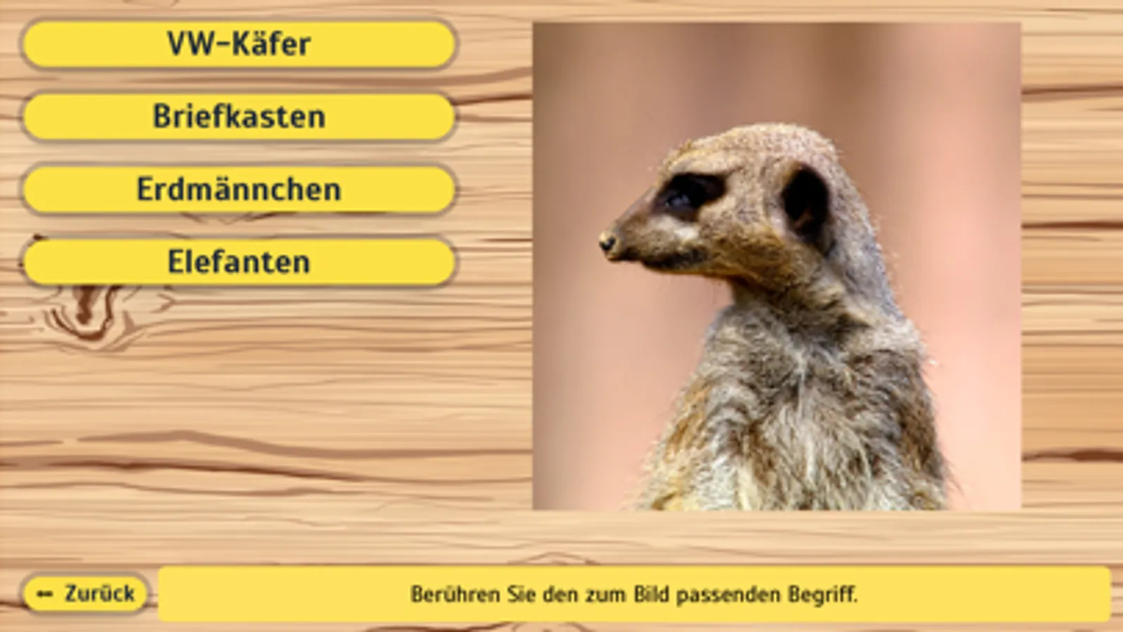 - Erkennen: Ein Bild wird präsentiert und aus den seitlich angegebenen Optionen muss die zutreffende Lösung ausgewählt werden. Das Spiel bietet drei verschiedene Schwierigkeitsstufen.