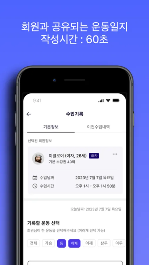 - 가물가물했던 저번 운동기록과 자세, 트레이너님의 운동일지를 보고 이제는 직접 편리하게 기록할 수 있습니다.