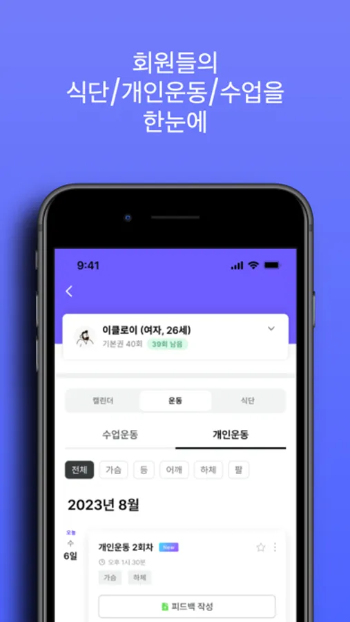 - 담당 트레이너와 공유되는 시간표를 통해 수업 일정을 잊지 않고 확인할 수 있습니다.