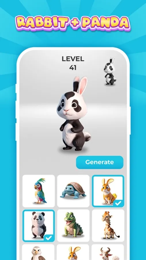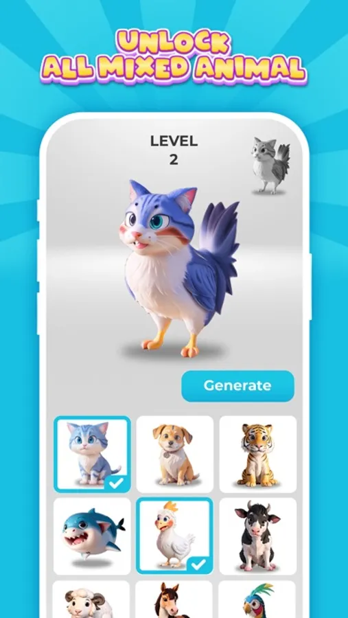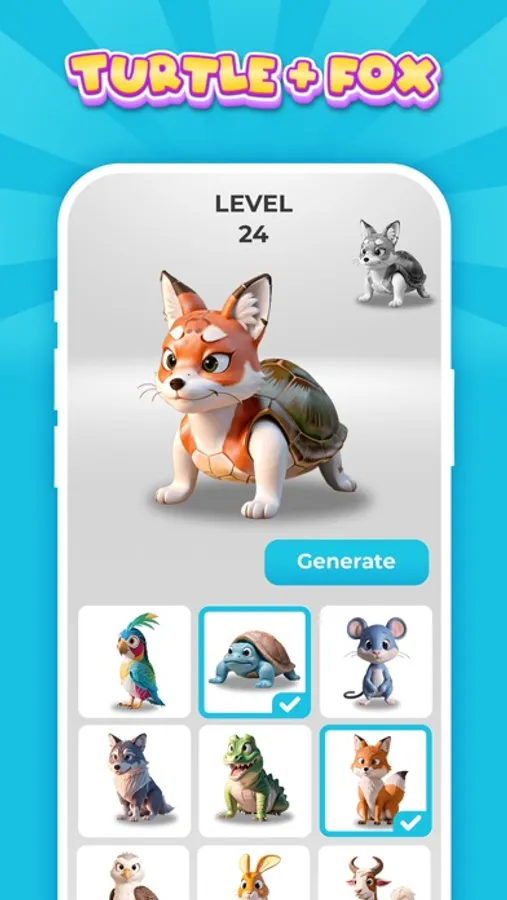 At each level's beginning, you'll see a picture of a charming creature made by mixing two animals using AI magic. Your goal is to identify the two animals that create this adorable blend.