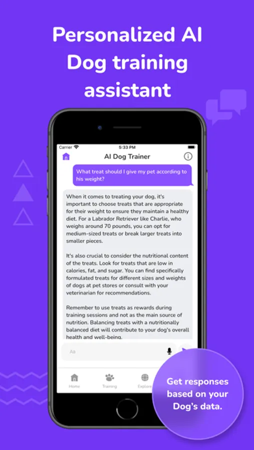 4. Personal Dog Training Assistant: Every dog is unique, and their Dog Training needs can vary. Our TrainMyDog AI Assistant provides personalized Dog Training tips and advice tailored to your dog's specific requirements. You'll receive guidance that takes into account your dog's age, breed, and temperament.