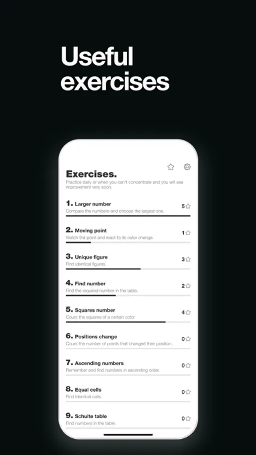 Feeling distracted? Open the app and dive into a series of meticulously designed exercises. You'll quickly notice a shift in your focus and memory levels. Our exercises are made to not only refine your concentration but also to enhance your logic, memory, and reflexes, all essential for top-tier productivity.