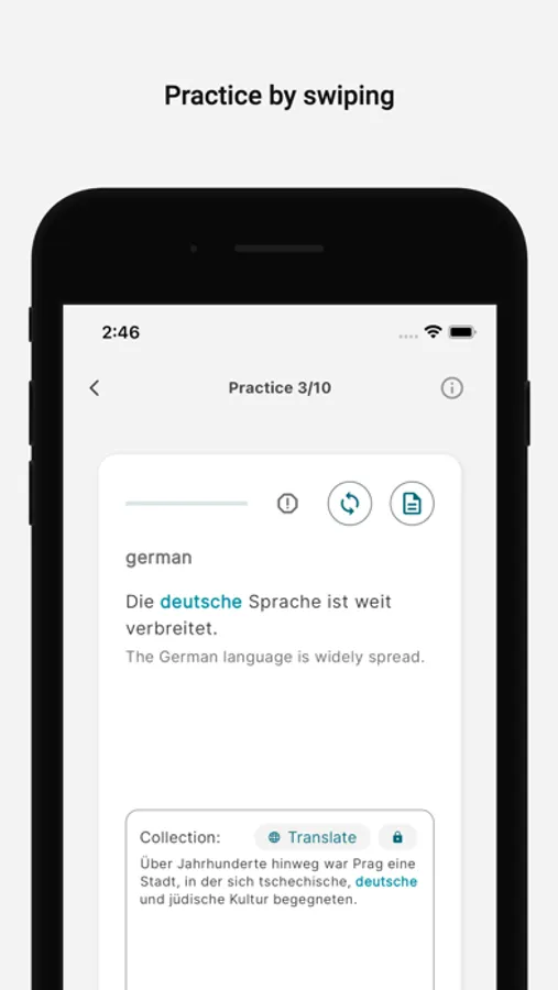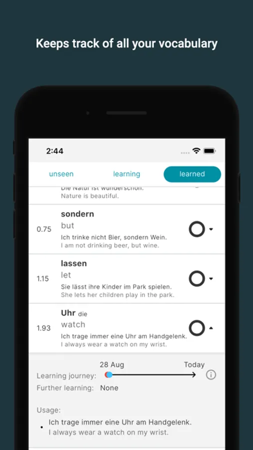 The spaced repetition algorithm makes sure, that each word is repeated only as much as needed.