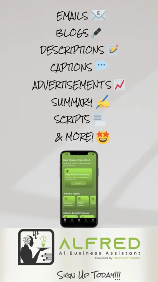 Meet Alfred: Your Personalized AI Business Partner. Elevate your entrepreneurial journey effortlessly. Crafted to understand you and your business intimately, Alfred is your ultimate support system. Our 13 Expert Chat Bots, from the innovative E-Commerce Assistant to the strategic Social Media Manager, seamlessly cater to your diverse needs. Need a Business Plan that reflects your unique vision? Alfred tailors it for you. Crafting a compelling Social Media Strategy? Alfred's got your back. Our Custom Templates, shaped by your inputs, bring your ideas to life. The Document Manager keeps all your generated content organized and ready to download. Alfred simplifies, accelerates, and refines – your dedicated co-pilot propelling your business dreams.
