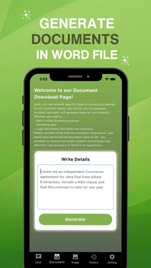 - Document Manager: Effortlessly access and download all your generated content, organized for your convenience.