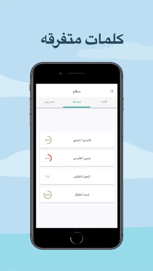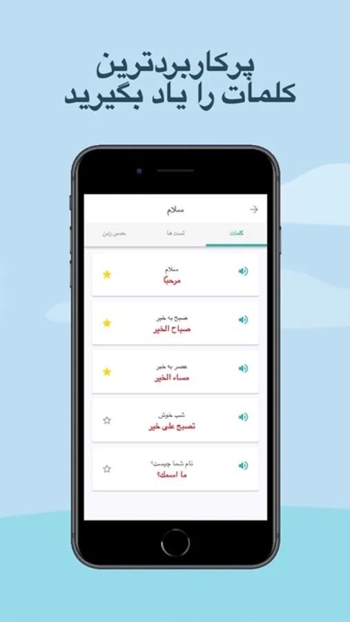 - تست های دستور زبان عربی، واژگان و مکالمه روزانه. شما به تدریج یاد خواهید گرفت و با اطمینان در سطوح مختلف خود پیشرفت خواهید کرد.