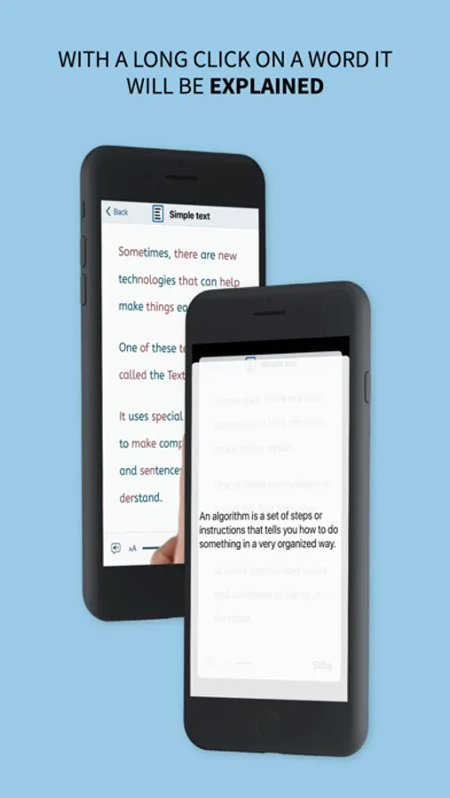 The Text Simplifier app makes difficult texts easier. Then the texts are easier to read and understand. And if you need help reading, the app can also read words to you. To do this, just follow along under the words with your finger. This app is for people with reading difficulties or beginning readers. It can also be very helpful in inclusive classroom instruction. There are then fewer barriers due to difficult texts. You have several options for simplifying texts: