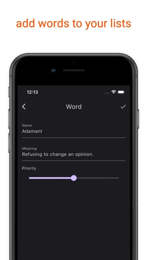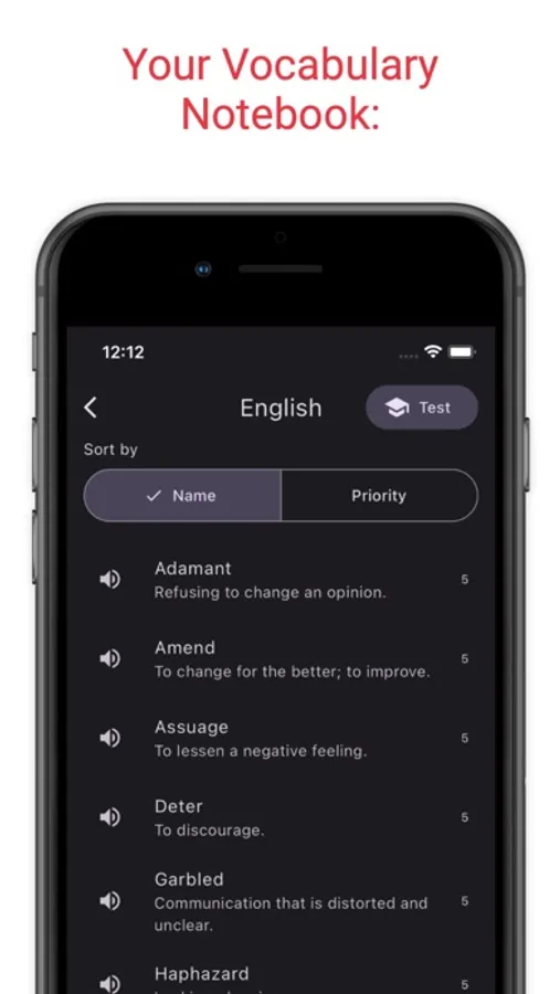 This app allows the user to create word lists in any language. In each word list, the user can add the words he wants to learn. Each word has a priority from 0 to 10, starting by default with 5 when it is added to the list. The user can test his knowledge of a word list. In the test mode, the user is shown a word, taken from the word list, on a card. He has to remember its meaning and pronunciation. Then he flips the card to discover the actual meaning and pronunciation of the word. If he remembered correctly he taps on a green check mark, and the priority of the words decreases, otherwise on a red cross, and the priority of the word increases. The priority test mode questions the user on the words with the highest priority. This is a good way to learn all the words of the list and improve the user's vocabulary and pronunciation.