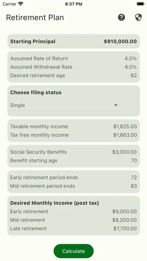 While the app is not a guarantee that you will have enough money for retirement, it is a great tool to forecast the amount of money you will have available throughout your retirement. It allows you to take an initial starting principal and input variables like assumed return rates and withdrawal rates and uses the current IRS tax tables to forecast your post-tax income each year.