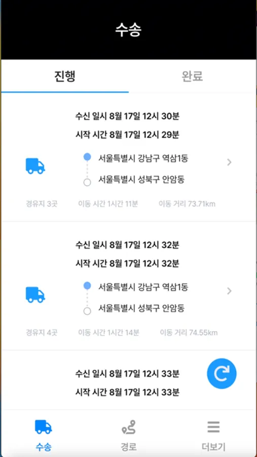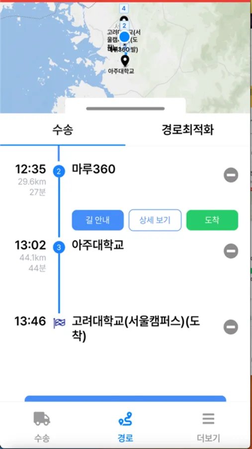 플롯(https://flrot.fleetune.com)에서 생성한 최적 경로를 네비게이션을 통해 길안내 받으실 수 있습니다.