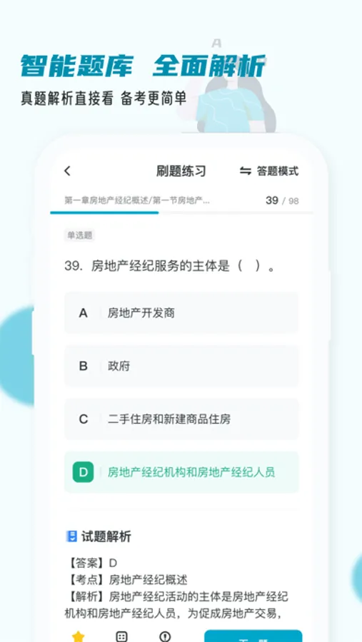 提供历年真题和专项考点的智能刷题备考、答案权威解析,零基础无压力通关,没有广告,无需付费!帮助超百万学生顺利拿到全国房地产经纪人专业人员职业资格证书!