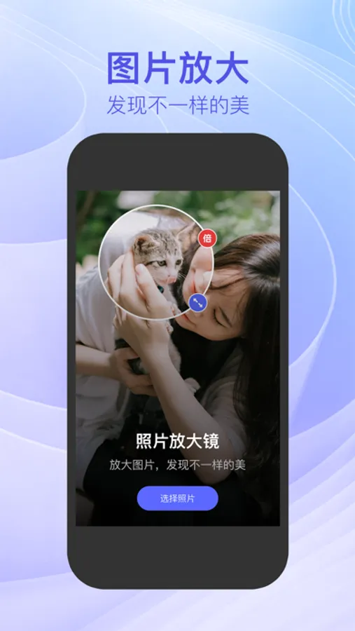 数码放大镜,可调变焦,控制简易,捏合放大/缩小,拖拽移动,让你可以清楚阅读微小的文字。