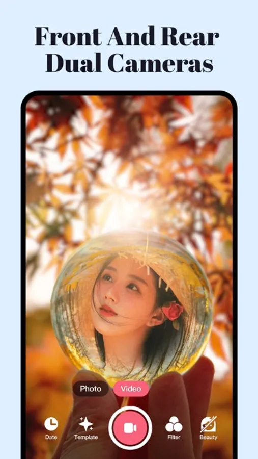 Redefine picture-in-picture photography (shooting videos) and picture beautification. You can start shooting with the front and rear cameras at the same time. Redefine photography. You can take selfies at the same time, and the rear camera can take pictures of beautiful scenery or him/her, and record the time and date at the same time. Dual cameras record beautifully at the same time.