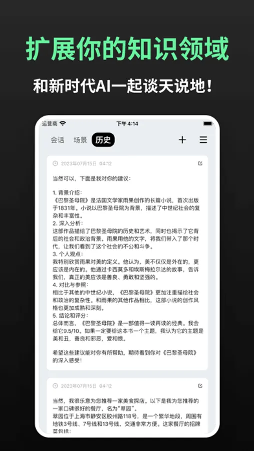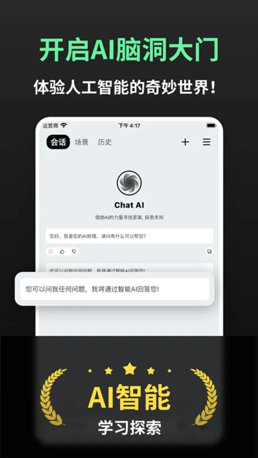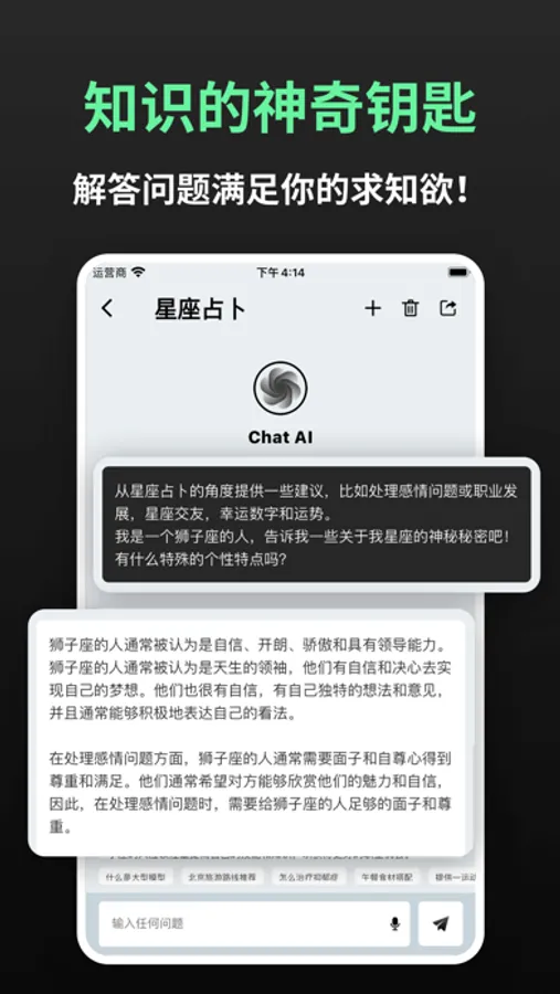 ChatAI是一款超级智能的聊天助手软件!它能像你的好朋友一样,陪你聊天,解答问题,提供实用信息,让你的生活更便捷!