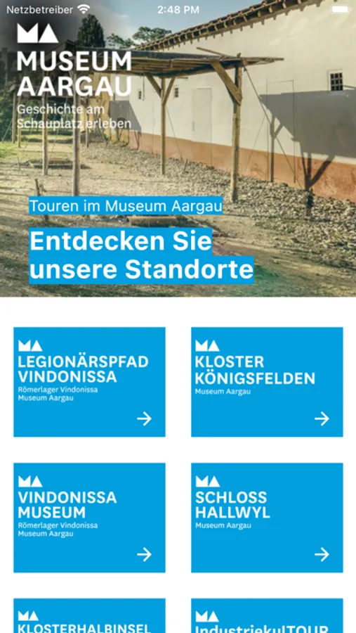 Der Museum Aargau Guide bietet Multimedia- und Audiotouren für Erwachsene, Familien und Schulen. Die App ermöglicht einen digitalen Zugang zu Ausstellungen, Rundgängen und Hintergrundinformationen an folgenden Museumsstandorten: Schloss Hallwyl, Legionärspfad Vindonissa, Vindonissa Museum und Kloster Königsfelden.