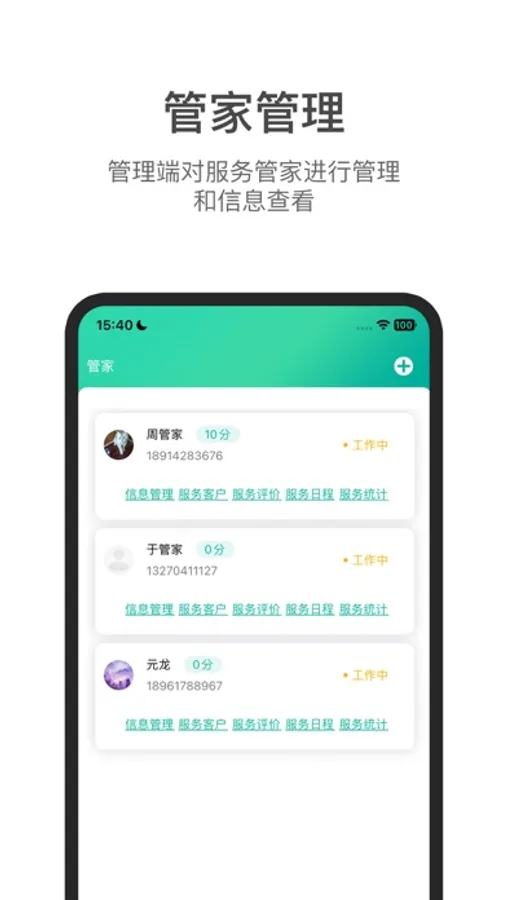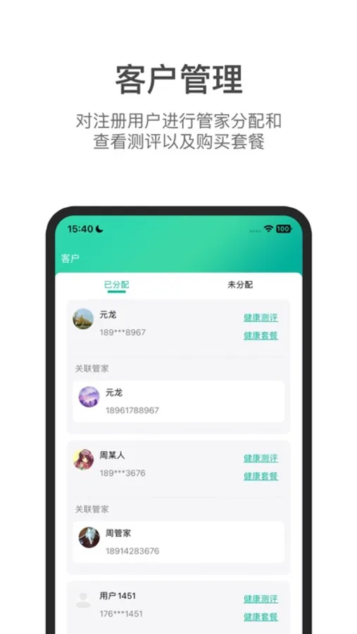客户管理:对注册用户进行管家分配和查看测评,购买相关套餐;