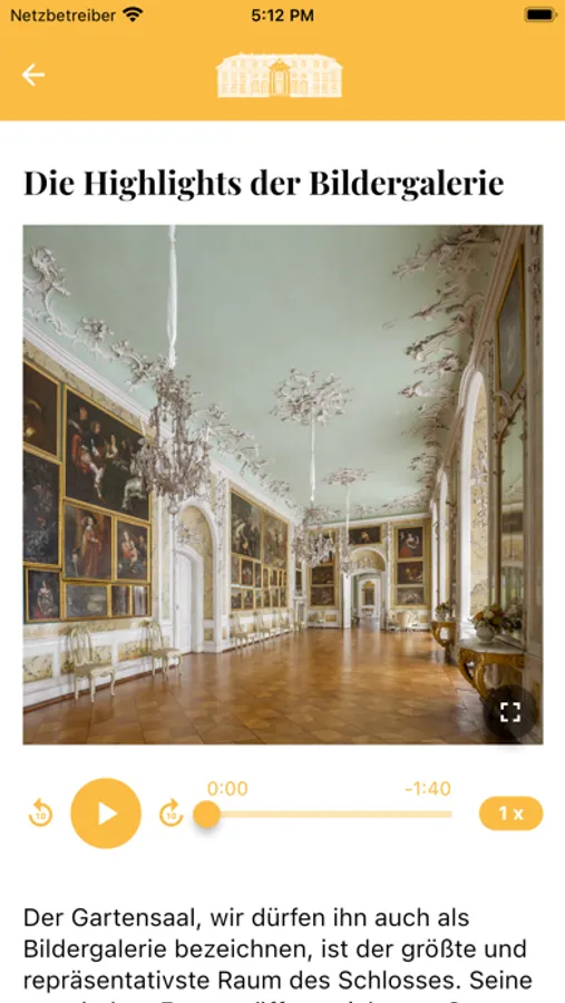 Sie erleben darüber hinaus die in ihrer historischen Ausstattung erhaltenen Kabinette, welche sich an den Galeriesaal anschließen. Wir laden Sie ein, mit der App die Festräume des Schlosses zu erkunden.