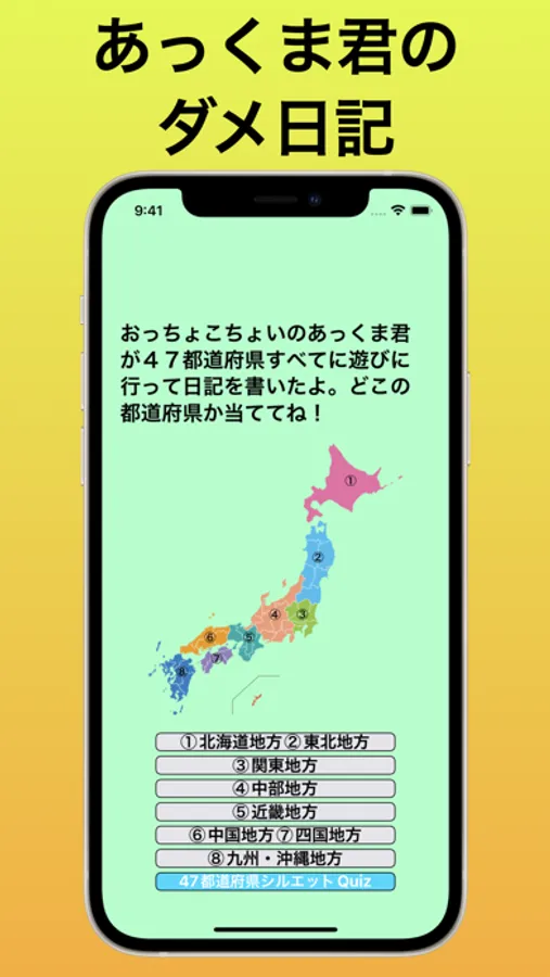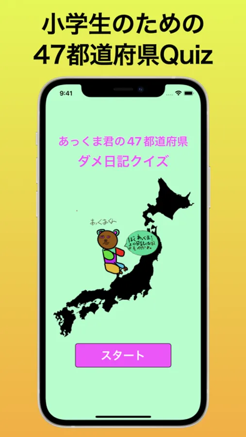 小学生が開発した小学生のための学習アプリです。おっちょこちょいのあっくま君が47都道府県を旅行して書いたダメ日記とシルエットを見て解答するクイズです。楽しく都道府県の豆知識やシルエットを覚えられます。シルエットだけでどこの都道府県なのか答えるクイズも選択できます。BGMはブルグミュラー25から「せきれい」と「優しい花」です。開発者が演奏しています。