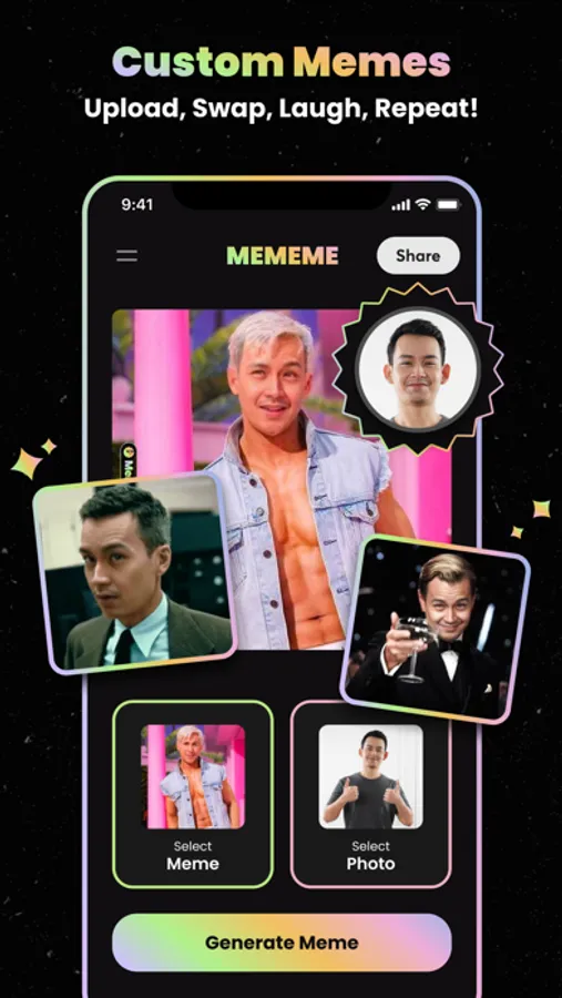 - Meme Creator: Unleash your creativity with our custom meme maker. Choose from our massive library of meme templates, and give them a personal touch with the MemeMe face swap and text editor features.