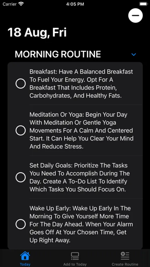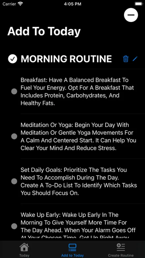 Elevate your daily life and embark on a journey to enhance your focus and productivity! Our Routines app guides you in building powerful habits and achieving significant success through small steps every day. Whether it's personal growth, health, or work, discover the transformative power of routines. With just a tap, start transforming your life.With our Routines app, make the most of every day in the most productive and fulfilling way. Start today and lay the foundation for a better future now!