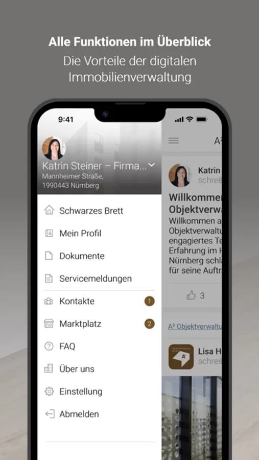 Als Kunde der A² Objektverwaltung GmbH profitieren Sie von einem besonders innovativen Kundenservice, der Ihnen viel Komfort bietet. Mit der A2PP können Sie uns rund um die Uhr Anliegen und Schäden inklusive Fotodokumentation per Smartphone melden. Zusätzlich stellen wir Ihnen eine digitale Dokumentenmappe mit wichtigen Dokumenten für Ihre Immobilie zur Verfügung. Über das digitale schwarze Brett informieren wir via Push-Nachricht proaktiv über wichtige Informationen rund um Ihre Liegenschaft.