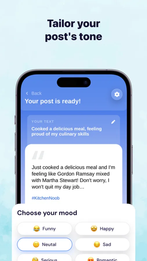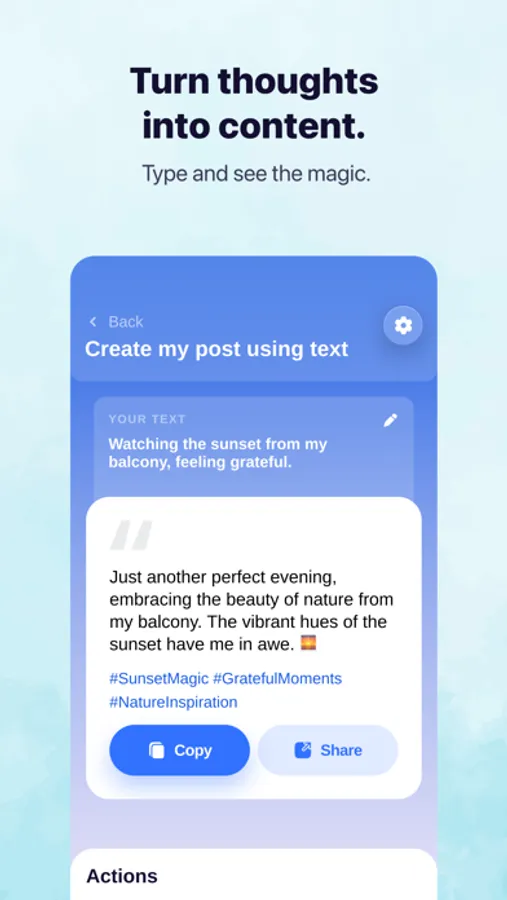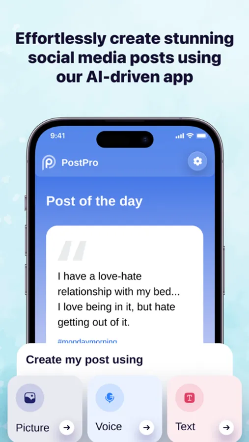 Whether you're uploading an image, recording a thought, or simply typing a sentiment, our app crafts the perfect post. Tailor your content's tone - be it funny, sarcastic, or any mood in between. Dive into an intuitive experience enriched with quality captions, taking your social media skills to the next level. Perfectly suited for platforms like Instagram, Twitter, Facebook, TikTok, and more.