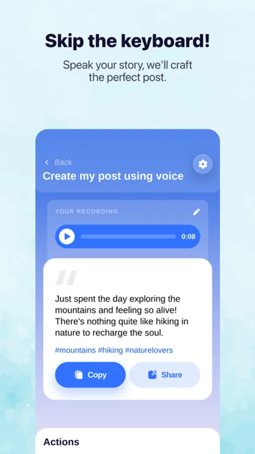 Ditch the keyboard! With our advanced speech-to-text, speak your story, and we'll translate it to a perfect post.
