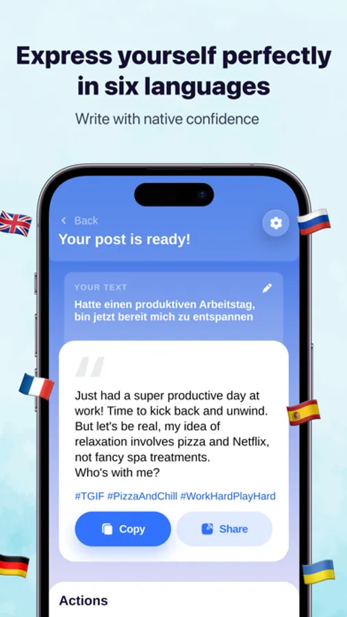 Flawlessly express yourself in English, French, German, Russian, Spanish, and Ukrainian. Write with the confidence of a native speaker.
