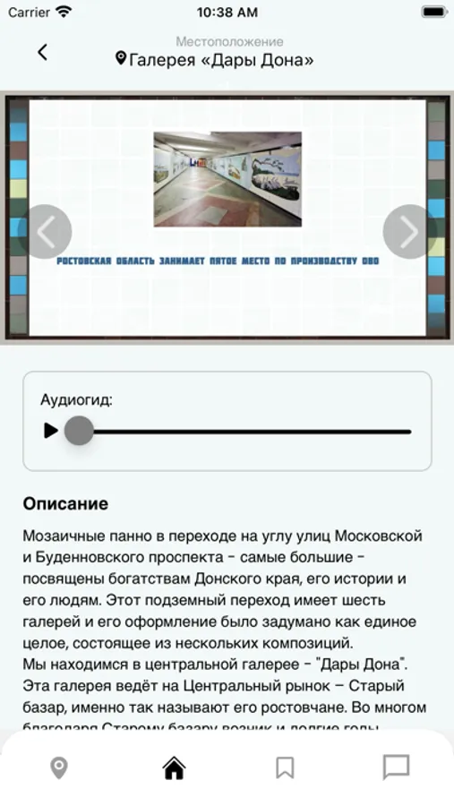 Откройте для себя новые стороны Ростова-на-Дону, мозаики в подземных переходах оживут и расскажут историю города. Живописный маршрут по подземным переходам – самая необычная достопримечательность России. Аудиогид поможет вам лучше проникнуться местной атмосферой, а навигатор не позволит потеряться.