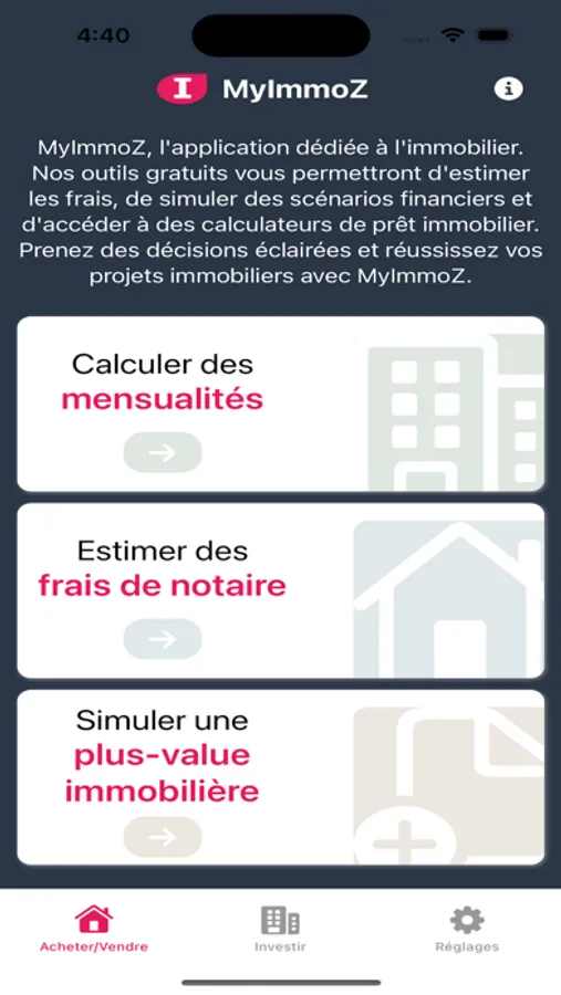 MyImmoZ est votre compagnon pour réussir vos investissements immobiliers en toute simplicité. Grâce à une gamme d'outils puissants et conviviaux, cette application vous offre une aide précieuse dans toutes les étapes de votre parcours d'investissement. Calculez rapidement votre taux d'endettement pour une prise de décision éclairée, évaluez le rendement locatif potentiel de vos biens, et explorez des solutions sur mesure pour maximiser vos profits. Que vous soyez novice ou expérimenté dans le domaine de l'immobilier, MyImmoZ vous offre des résultats précis en quelques clics, vous permettant ainsi de prendre des décisions stratégiques en toute confiance. Simplifiez votre chemin vers la réussite immobilière avec MyImmoZ – votre partenaire dévoué dans l'univers de l'investissement.