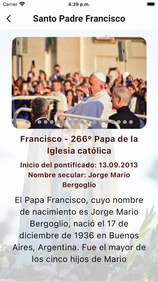 - **Historia del Papa Francisco:** Sumérgete en la vida y el mensaje del Papa Francisco, con detalles sobre su trayectoria y sus enseñanzas.