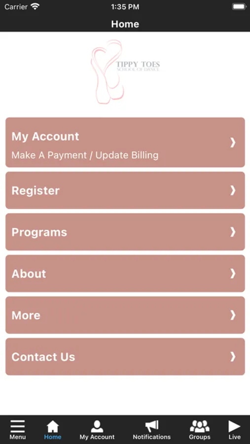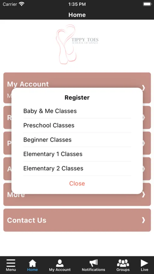 The Tippy Toes app allows you to manage your account with ease, register for classes, and live stream classes. You'll also receive important notifications about class changes, closings, registration openings, special announcements, and upcoming events.