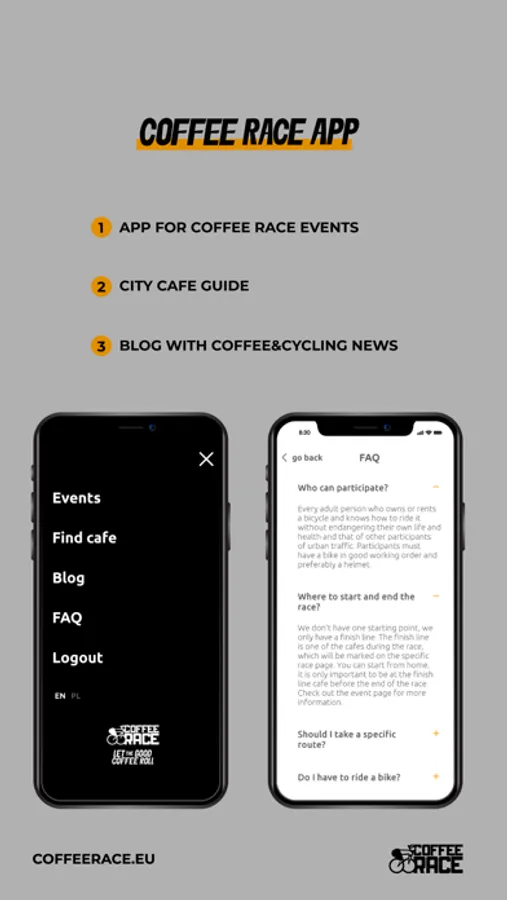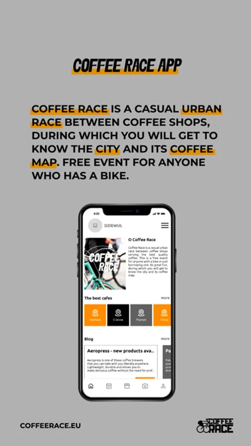 We organize the Coffee Race to give you a fun time! To show you where to find the best coffee in your city and meet people who share similar passions. Pure fun, lots of excellent coffee, and a reason not to stay home. The Coffee Race application is not only a tool that allows you to take part in our events, but also a coffee shop search app. On our blog you will read what is happening in the specialty coffee industry, but also about interesting facts from the bicycle industry. The application is free, you can download it and see what's in it without creating an account. Creating an account will be necessary if you want to take part in one of our Coffee Race events.