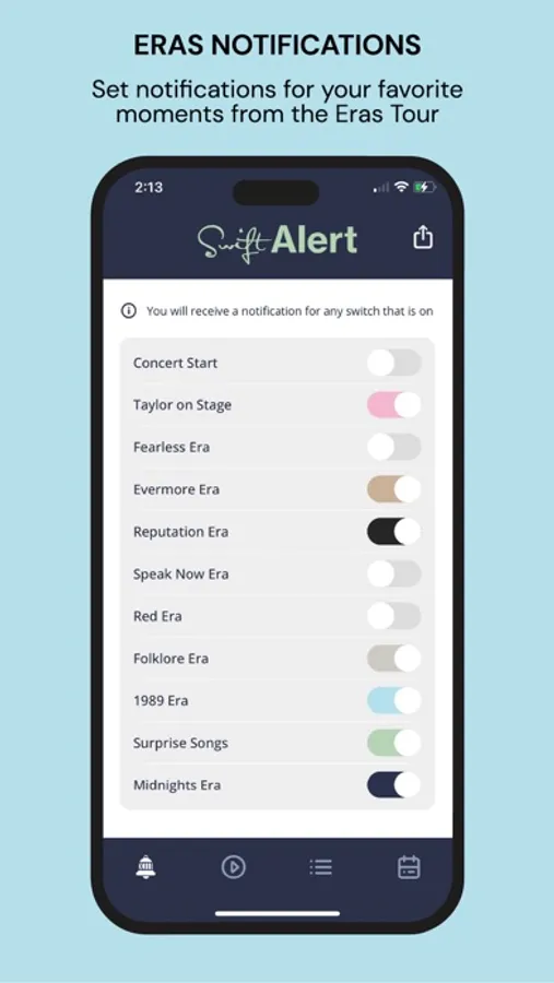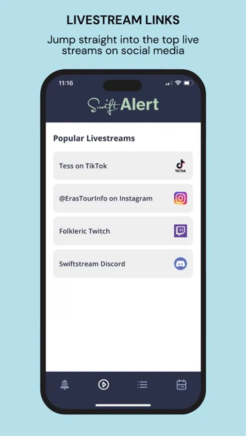 As the Eras Tour moves around the world, we know you don't want to miss a minute. Swift Alert will send you push notifications for the Eras and moments that you want to see. Stop doing the math to calculate time zones and set alarms on your phone; just set your alert preferences and we'll send you alerts so you can jump straight into the most popular Eras Tour livestreams on the internet.