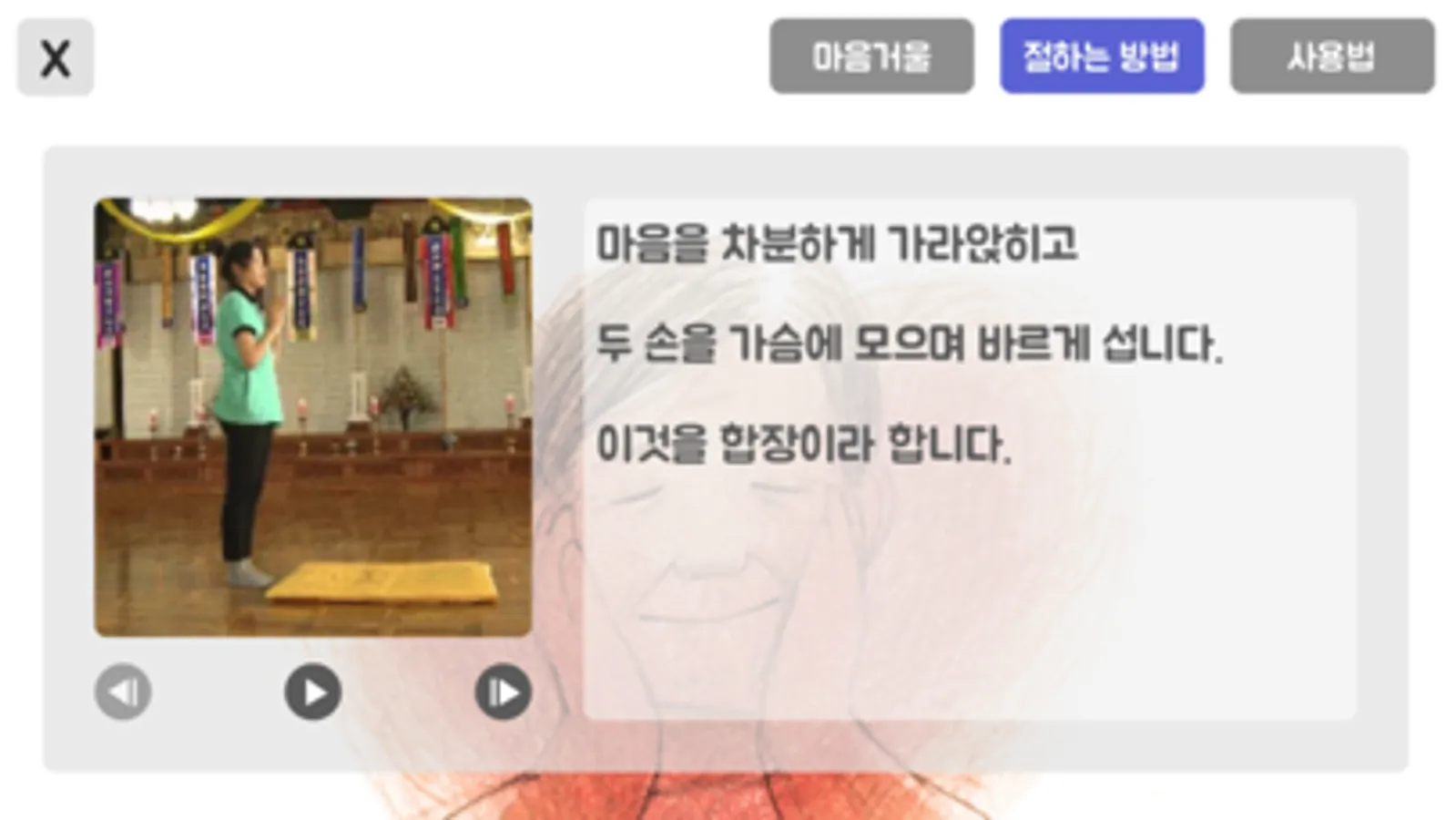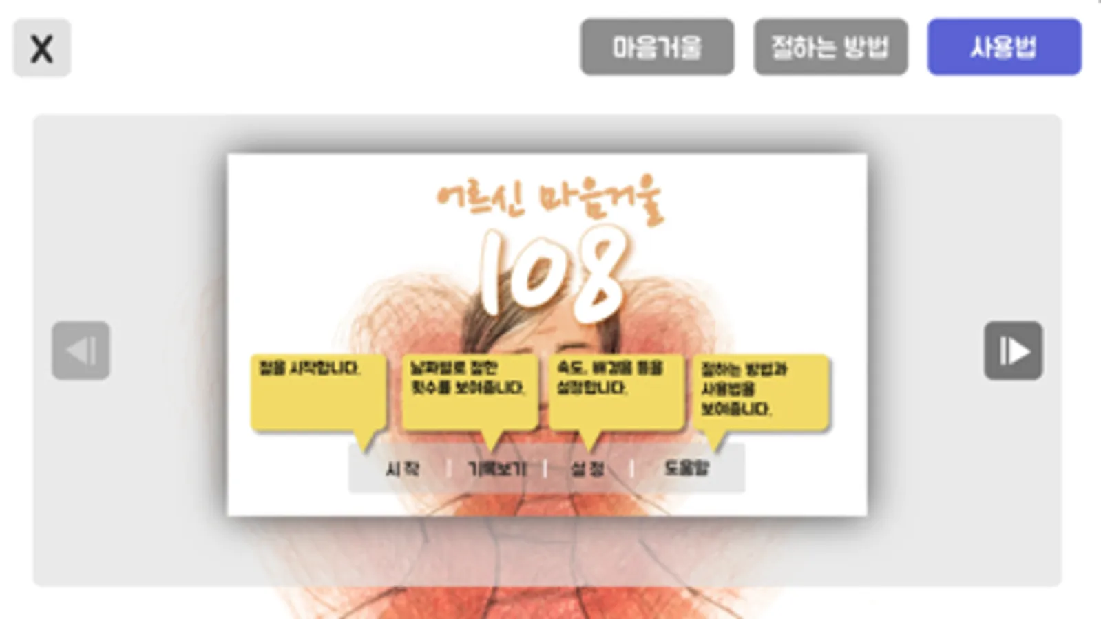 어르신께 맞는 108가지의 발원문과 함께 개인의 상황에 따라 다양하게 활용할 수 있는 절수행 앱입니다.