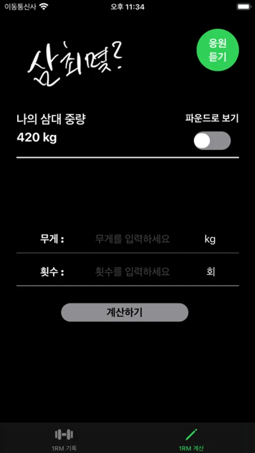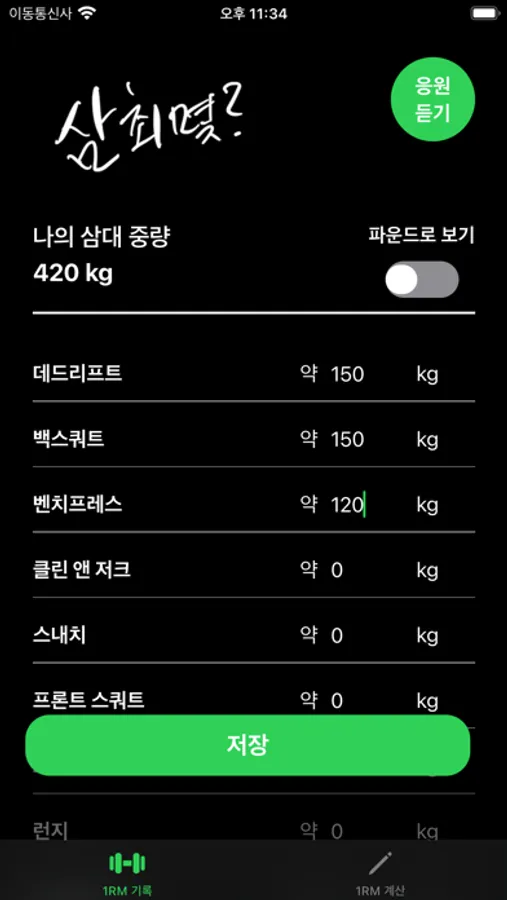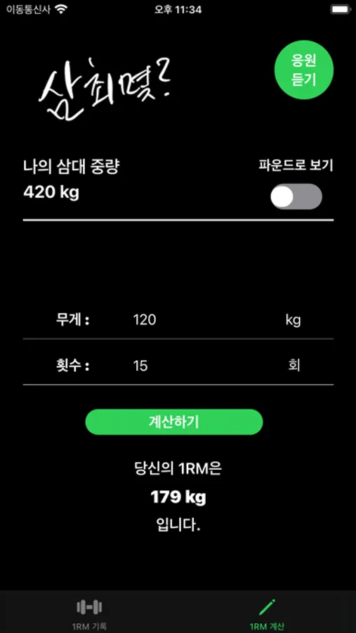 삼최몇은 1RM을 모르는 사람들에게 1RM이 얼마정도 일지 계산도 해줍니다.