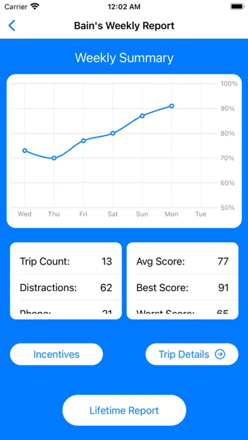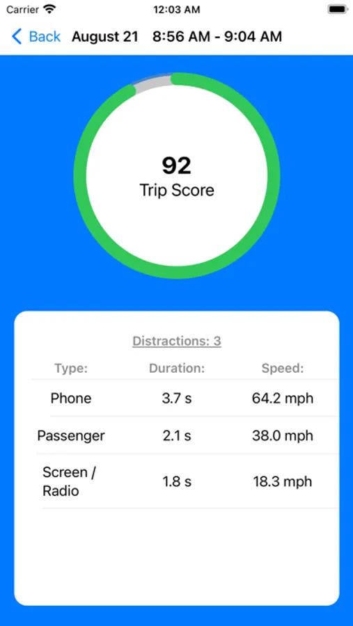 Alleviate the worry of distracted driving and develop safe driving habits through real-time redirection and weekly trip summaries! The Soter Driving App can detect when you are distracted while driving and attempts to redirect your attention back on the road through a pinging noise. You can join a group with other users, then view each other's weekly reports and trip summaries to facilitate discussions about how to be a safer driver. Safe travels!