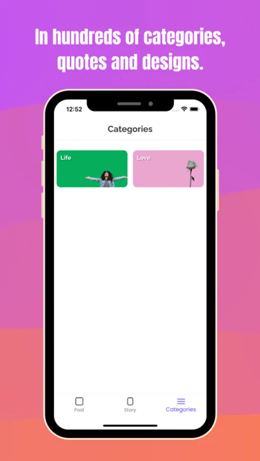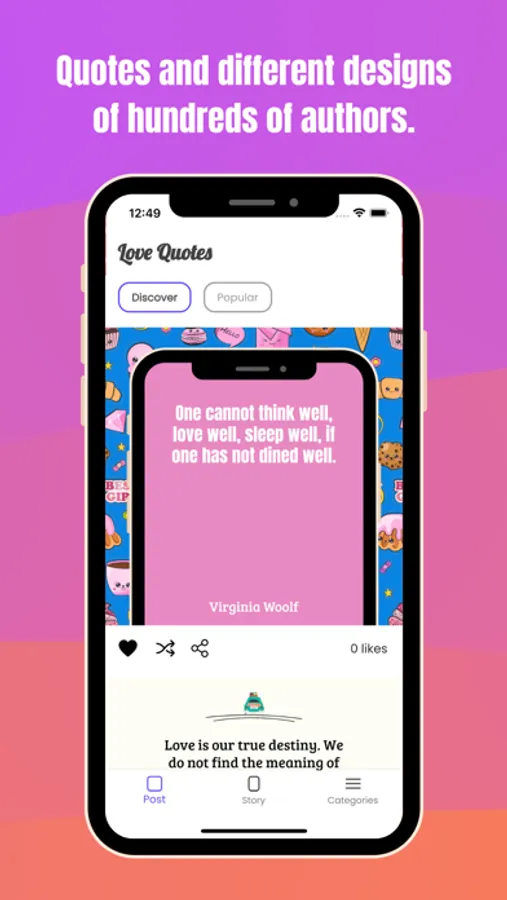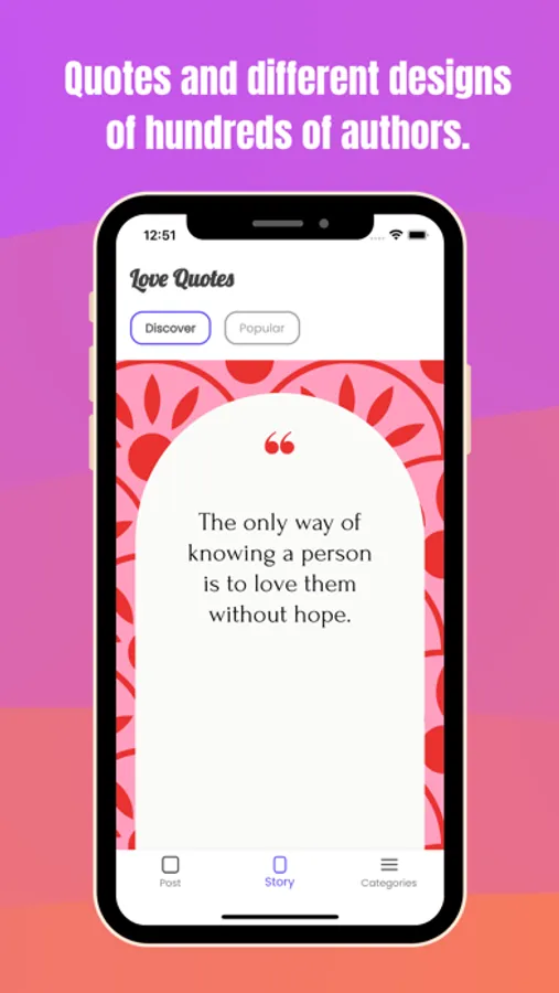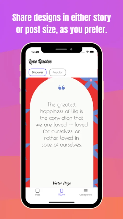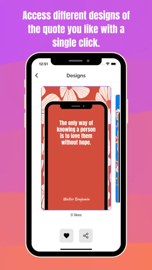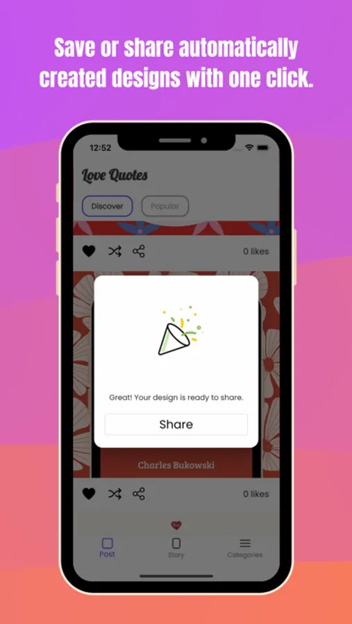 Discover hundreds of categories and thousands of quotes and designs from various authors. Choose from a variety of automatically generated designs for the same quote. Share your designs across all your social media accounts with a single click.