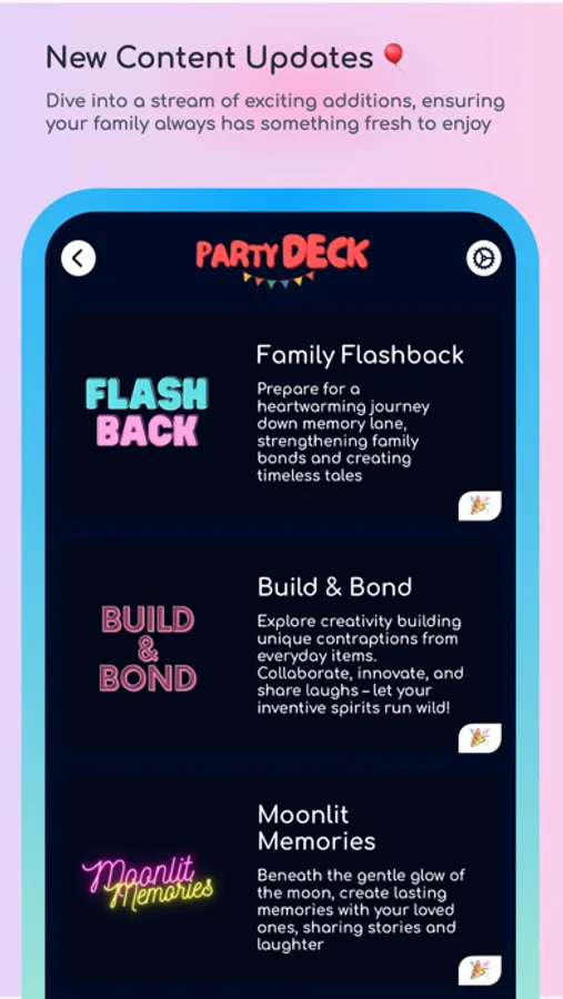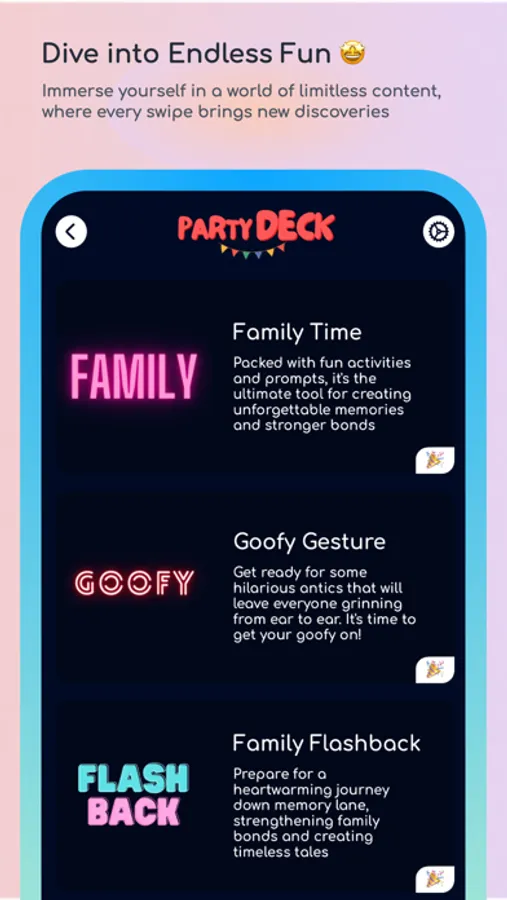 From creative challenges that fuel imagination to heartfelt conversations that nurture communication, the Party Deck - Milk Edition caters to diverse interests and age groups. The prompts and activities are carefully designed to create lasting positive effects on family dynamics, making this app a cornerstone for fostering stronger bonds.