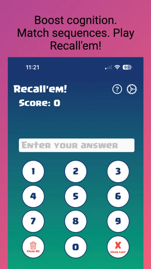 Whether you're looking to enhance your memory prowess or simply seeking an enjoyable mental challenge, Recall'em is the perfect game for you. Sharpen your memory, challenge your friends, and see who can conquer the art of remembering number sequences. Get ready to embark on an exciting journey of memory mastery with Recall'em Number Challenge!