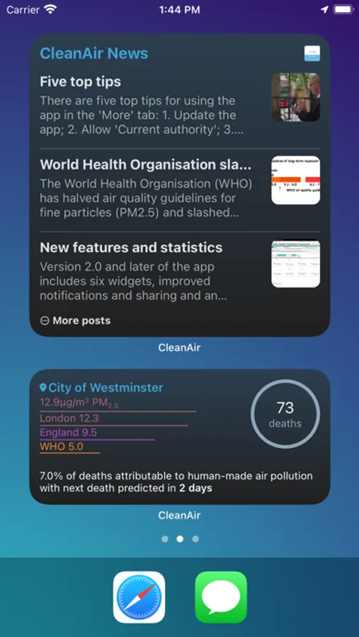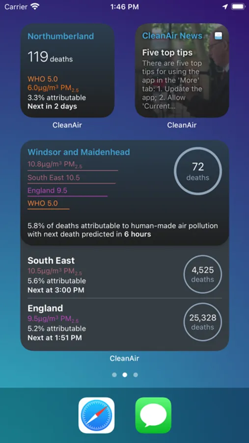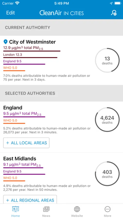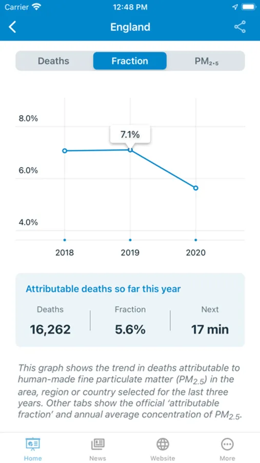 This App reports the health impact of long-term exposure to dangerous airborne particles (PM2.5) for the population in local areas, regions and England as a whole. The App estimates the number of deaths attributable to air pollution on a pro rata, calendar year-to-date, basis and the time to the next attributable death as well as displaying the percentage of total deaths attributable to air pollution. It does not estimate or display the number of actual deaths from air pollution or the risk for an individual. Users can also see estimates for total population-weighted exposure to annual average concentrations of PM2.5 in different local areas and/or regions relative to World Health Organisation guidelines and England as a whole