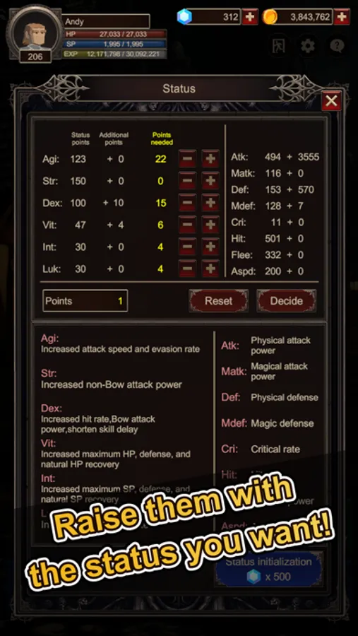 You can also reset your hero's status as many times as you like, so you can try and error until you create your ideal hero.