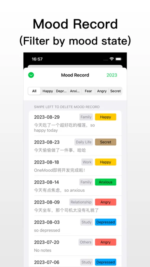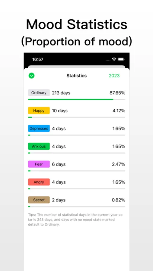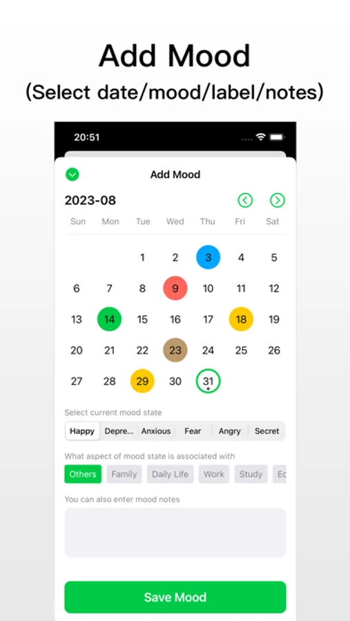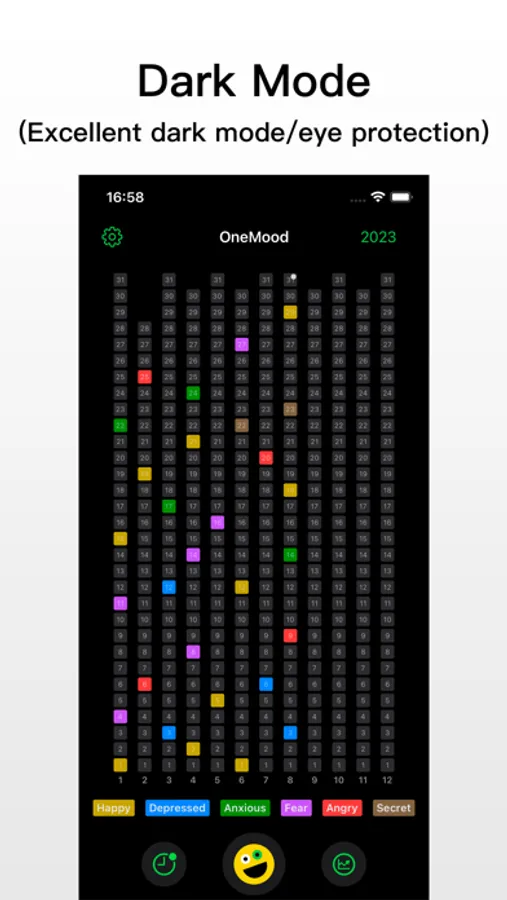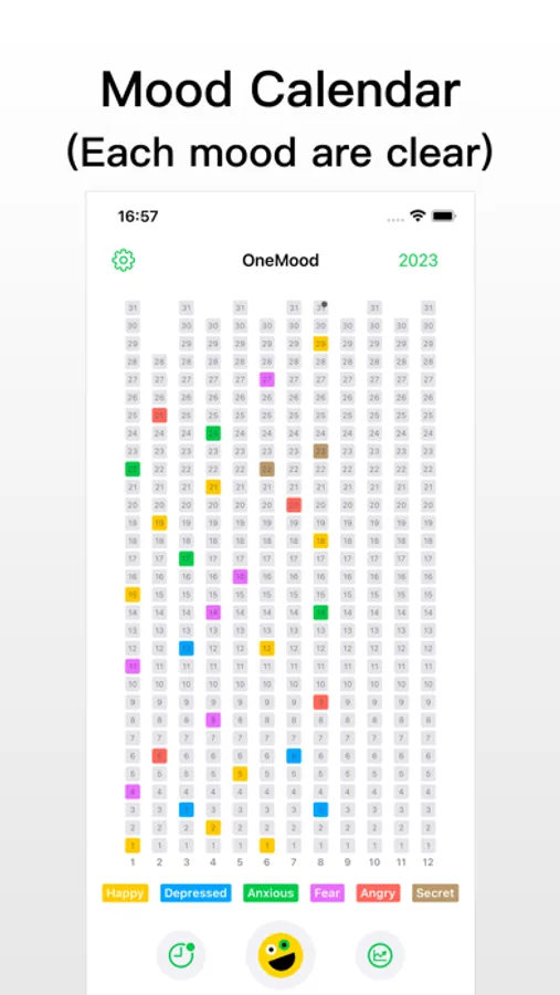 You can quickly record your daily mood state on OneMood, and OneMood visually displays your recorded mood state with a unique annual calendar grid view. OneMood can also count the frequency and proportion of each mood for you, so that you can clearly know how your overall mood & emotional state is.