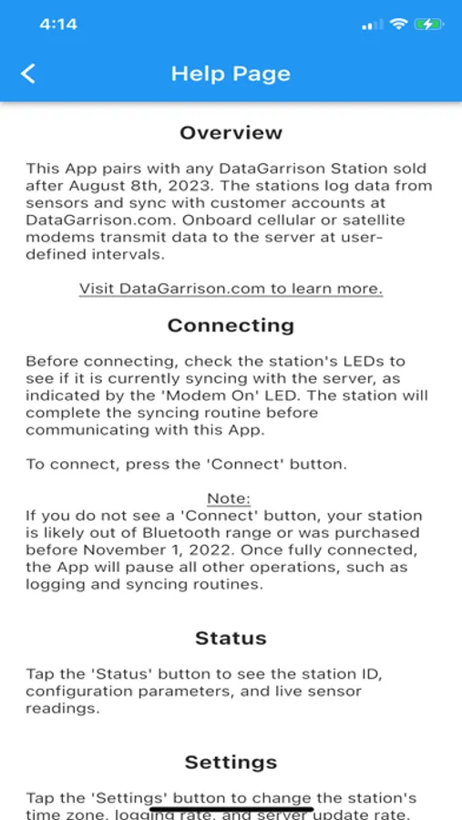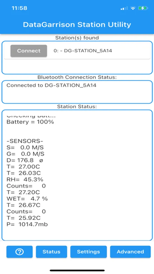 The DataGarrison Station Utility allows users to communicate over Bluetooth with stations in the field. Station status, sensor values, wireless signal strength, and more can be queried. The App can also change the data logging and server update rates. An Advanced page is available to update station firmware or to communicate with the station or connected sensors via raw ModBus, SDI-12, or modem AT commands. This App is compatible with all DataGarrison Stations (satellite and cellular) sold after August 7, 2023, or with earlier stations with the latest firmware and Bluetooth module. If you are unsure if your station has a compatible Bluetooth module, you can confirm by locating it in the lower-left corner of the station's main circuit board and to the left of the battery connector. Older stations without the latest module had nothing there.
